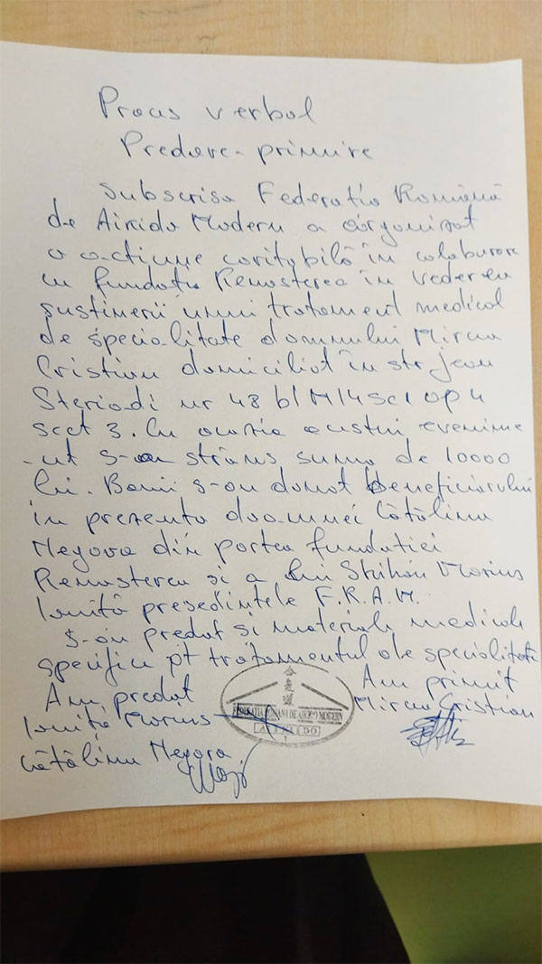 Dragi prieteni,din nou puterea lui 1+1+1+1+1...... a reușit să aducă un zambet pe chipul greu încercat al bătrânului sensei. A plâns de bucurie pt că speranța și optimismul si-au făcut loc din nou în viața lui.Surpriza a fost și mai mare pt că nu știa nimic. 10000 lei și un pachet cu materiale medicale specifice îl vor ajuta sa treacă peste luna octombrie care va fi hotărâtoare pt el. Analize,CT, RMN și alte medicamente la care se gândea că nu va avea șanse să le facă și să le aibă care erau vitale pt el sunt posibile datorită inimii voastre pline de iubire pt că nu poți face o faptă bună dacă nu ai dragoste. Când a izbucnit în lacrimi am rămas cu toții fara cuvinte. Mulțumim mult tuturor pt gândurile și faptele minunate pe care le-ați făcut Va doresc o săptămână excelenta.
